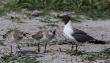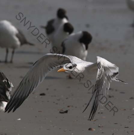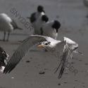 | 7/22/2014 Huguenot Memorial Park, FL: (Yes, again.) We had to see the Royal Tern young all grown up and taking flight. Laughing Gulls were trying to steal the fish and had their own young still begging. Also a distant Great White Heron , Black Skimmer family (they had 2 juv), and Great Blue Heron. |