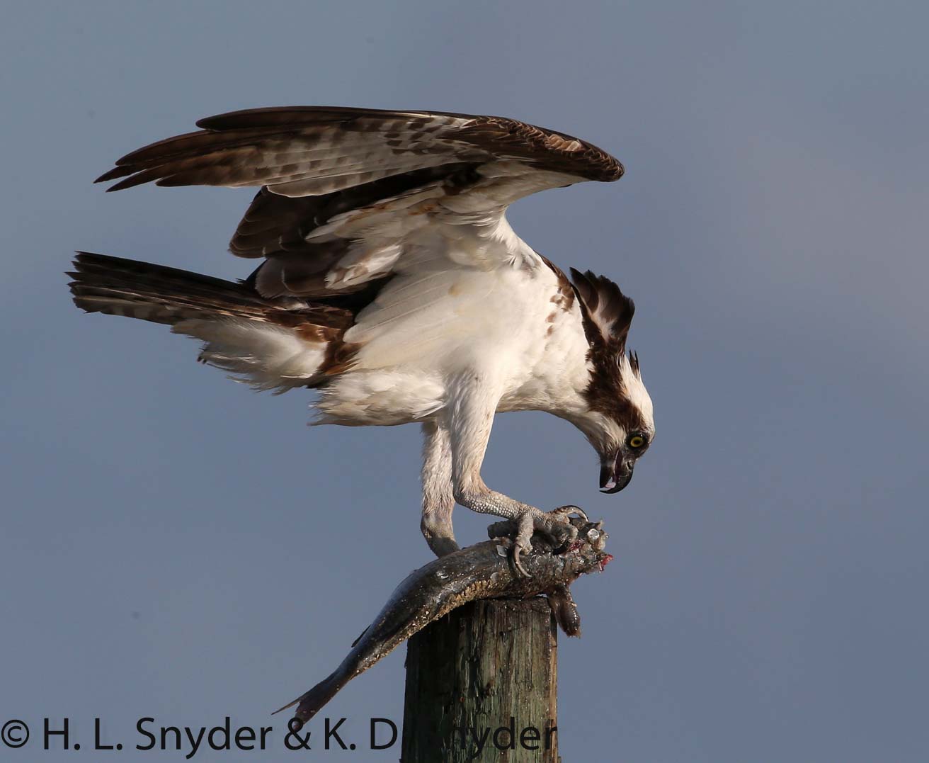 | 5/23 + 28/2015 Amelia Island, FL: As we rounded a bend on one of the beaches, it was fabulous to catch an Osprey sitting on a post, eating a huge fish it had just caught. It was hungry enough not to care about us or the bothersome Northern Mockingbird that was making it quite clear the Osprey was not welcomed in the neighborhood. The mockingbird finally won. After chowing down a good portion of the fish, the Osprey made off with the rest of its meal to eat it elsewhere in peace. Also, Common Ground-Dove , Brown-headed Cowbird , Northern Cardinal , Royal Terns interacting , Redknot , Eastern Towhee (f), and Brown Pelican . From back in February,2015: A few late pics from Florida: Blue-headed Vireo , American Kestrel , Eastern Meadowlark , Northern Cardinal , Pine Warbler, Sandhill Crane , White-eyed Vireo , and YRWA . |