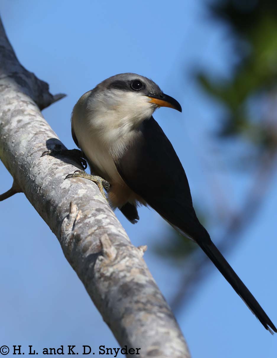 | 4/28,29/2018 : The Florida Keys, FL: Since we do not use tapes, what a treat it was to see a Mangrove Cuckoo out in the open. It was a thrill to see it hunt along the edge of the mangroves. Then, a Wurdemann's Great Blue Heron showed up and caught a fish for us. A white morph was also seen (unfortunately backlit). Also shown: Gray Kingbird , Black-whiskered Vireo , and Black-and-white Warbler . |