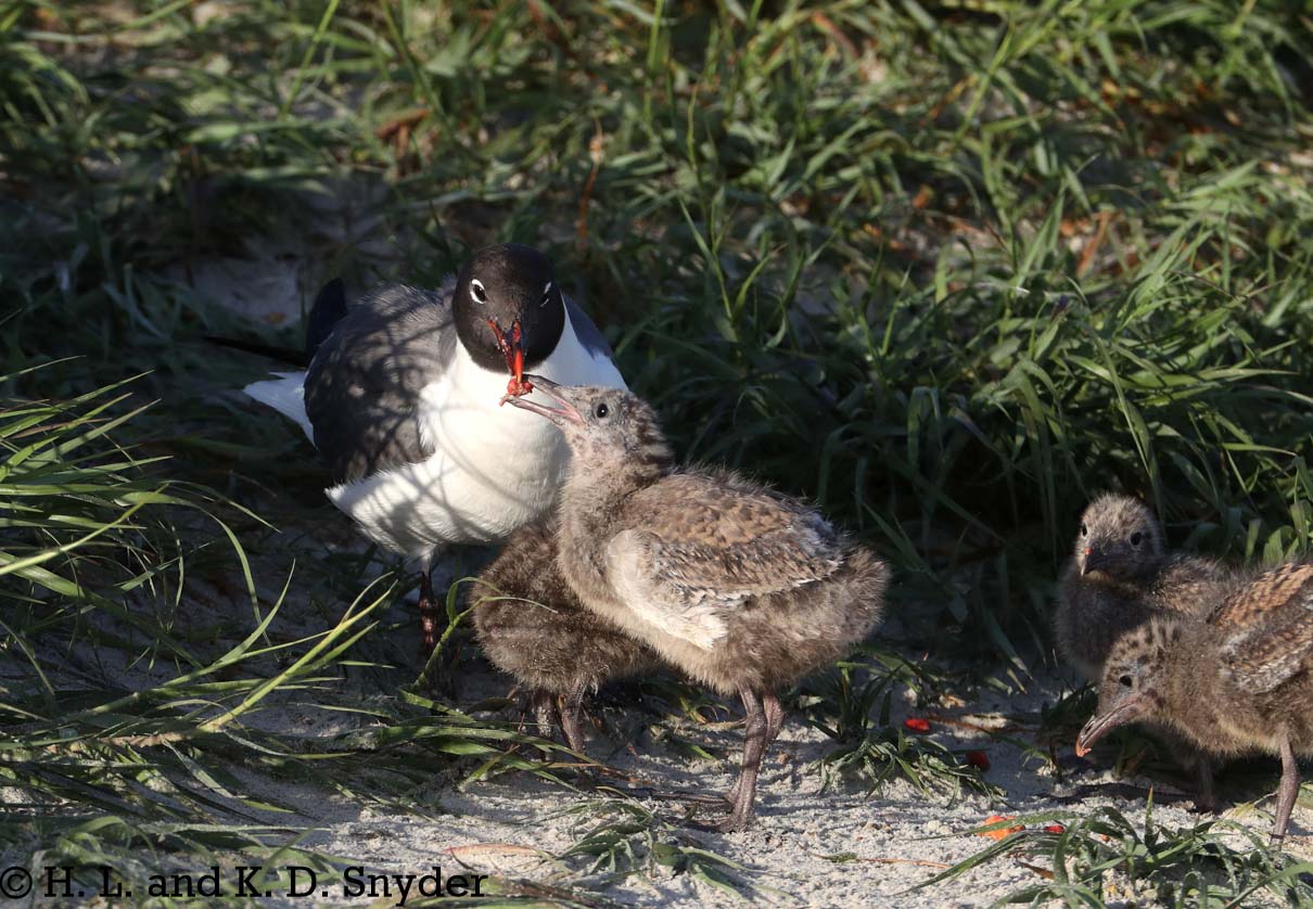 | 6/14/18: Jacksonville, FL: On the beach, Laughing Gull parents were feeding their young (Click on NEXT PAGE below for more of these), Brown Pelicans are still incubating (we hope), and Royal Terns are having their young in the dunes. |