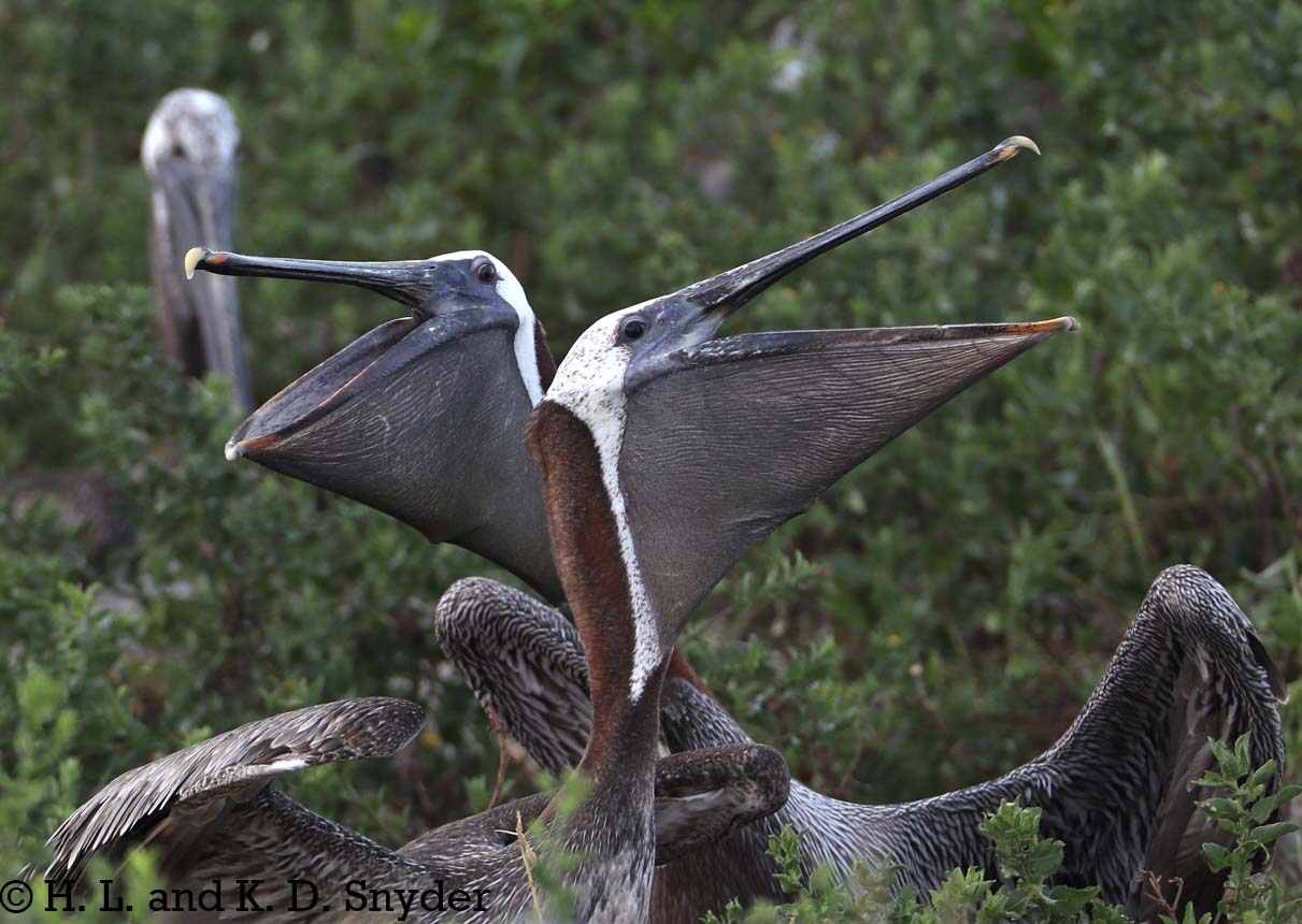 | 7/1/18 to 7/12/18: Huguenot Memorial Park, JAX, FL: Brown Pelican chicks are growing and are easier to photograph as they peer above the rims of the nests. The parents regurgitate fish and the tiny chicks feed on it at the bottom of their nests. Afterwards, the parents can be seen cleaning it up. Both parents are taking care of the young and it is fun to watch the changing of the guard. The adults continue to fix and build up their nests - it is amazing what they can do with their long, awkward bills. It is a treat to have the colony here this year and we hope they are successful! |