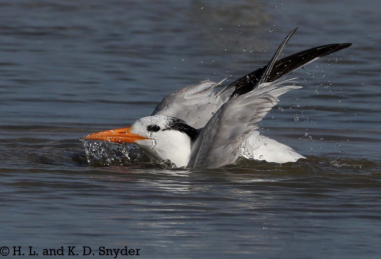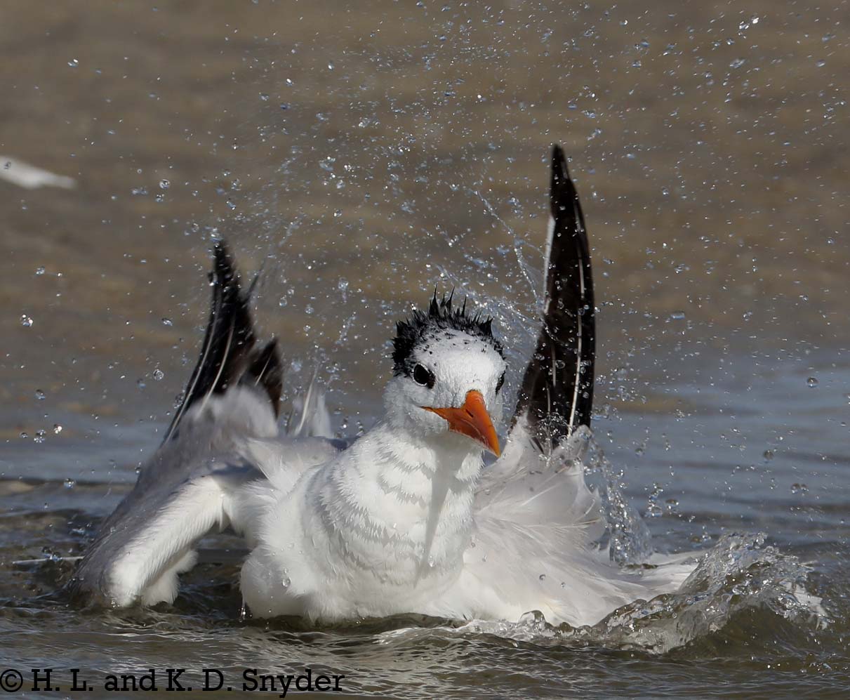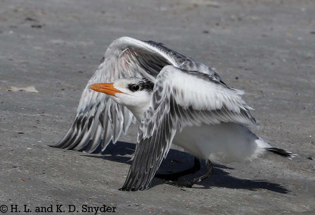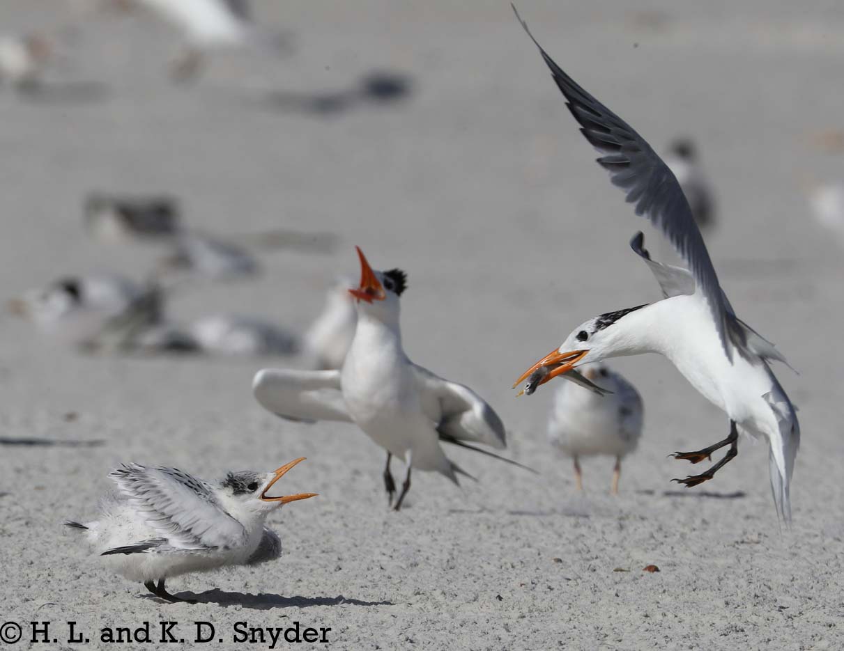 | 7/1/18 to 7/12/18: Huguenot Memorial Park, JAX, FL: Royal Tern with young. Laughing Gulls are always trying to steal the fish the parents bring in for their chicks, so the adults have to feed them fast! It is interesting to see the parents herd the mass of chicks down to the water. Also shown: Laughing Gull with "teen" juvenile still begging. |